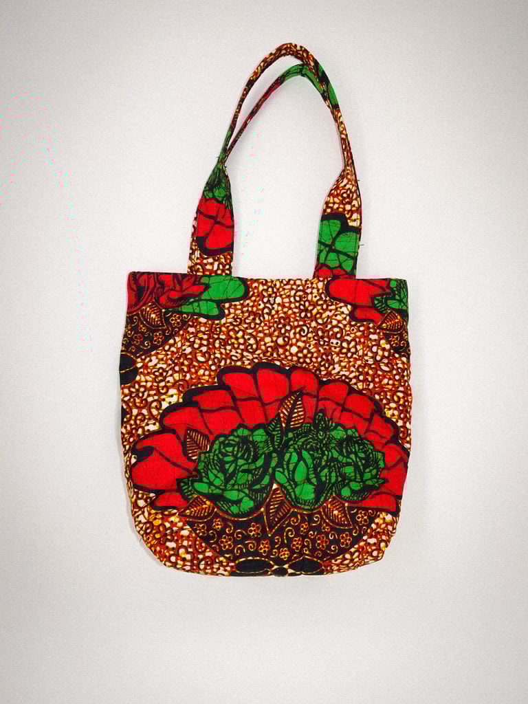 This handmade quilted tote bag, size medium, is made from 100% cotton Ankara Wax print fabric from West Africa. It includes a single set of shoulder straps, two internal pockets, and a magnetic snap bag closure.
